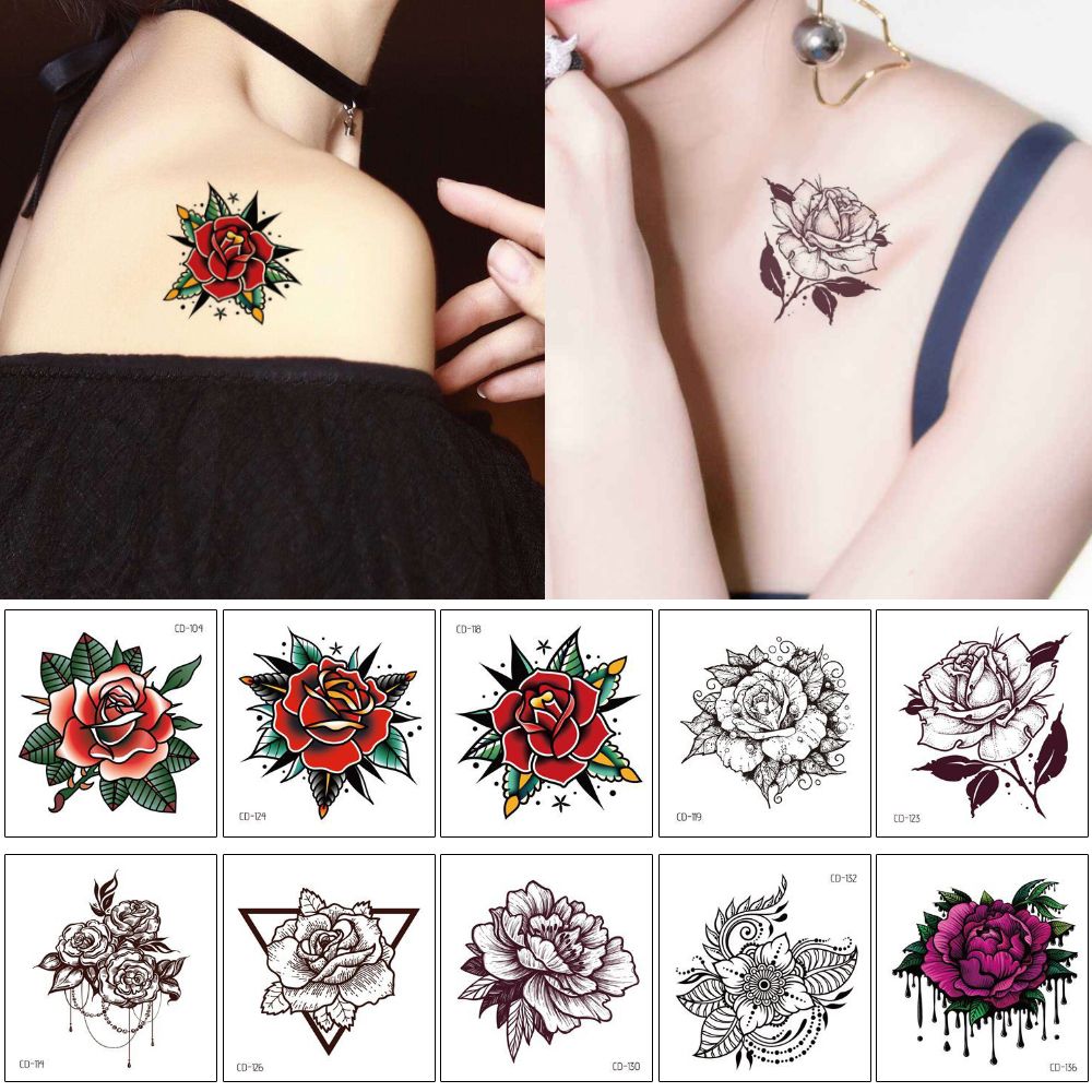 1-48 of over 1000 results for red rose tattoo RESULTS Oottati Waterproof 4 Sheets Back of Hand Fake Temporary Tattoo Stickers - Colorful Red Rose Snake Flower 4 Count Pack of 1. Black And Red Rose Tattoos On Both Hands. Fancy Red Flower Tattoo On Hand Vibrant red rose with green leaves with colorful patterns of flowers and leaves on stems.